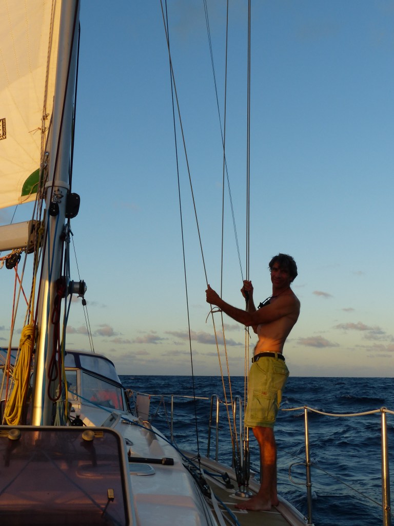 Nous sommes le centre d’un disque bleu que rien ne vient perturber. Tout est serein, l’immensité, les bercements réguliers du bateau, l’incroyable multitude d’étoiles que l’on contemple la nuit en écoutant une musique douce, Pink Floyd, Natacha Atlas, la chaleur du soleil sur notre peau et le vent des alizés qui atténue ses brulures. Ici, nous vivons une parenthèse dans nos vies, le temps n’a plus d’importance, les jours s’écoulent semblables les uns aux autres et nous oublierions la date si nous ne la notions chaque jour sur notre carnet de bord. Nous sommes maintenant imprégnés par la lenteur du voyage, je crois que nous avons abandonné toutes nos mauvaises habitudes liés à la course de la « civilisation », même que si ça continue, on écoutera Moustaki en boucle!