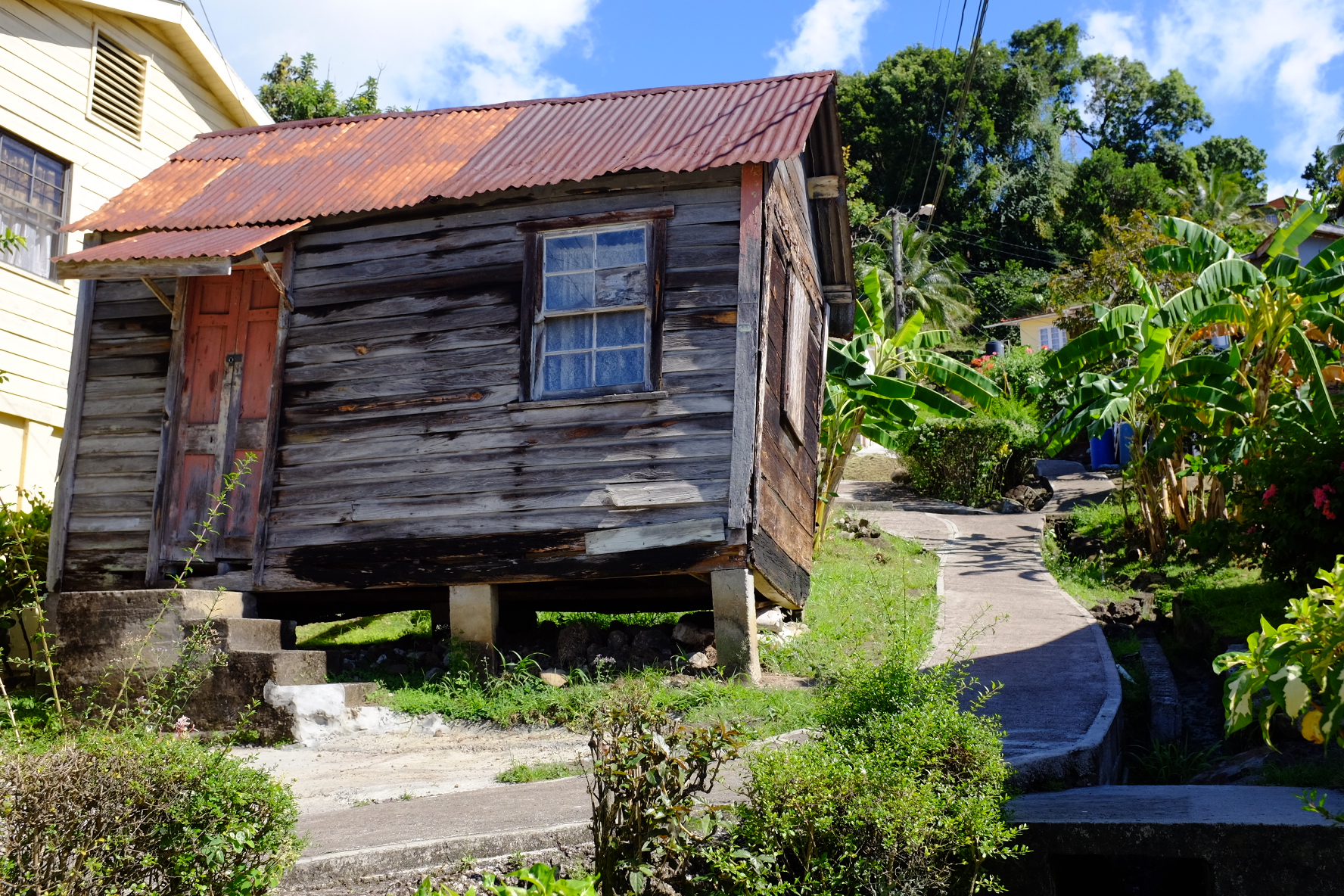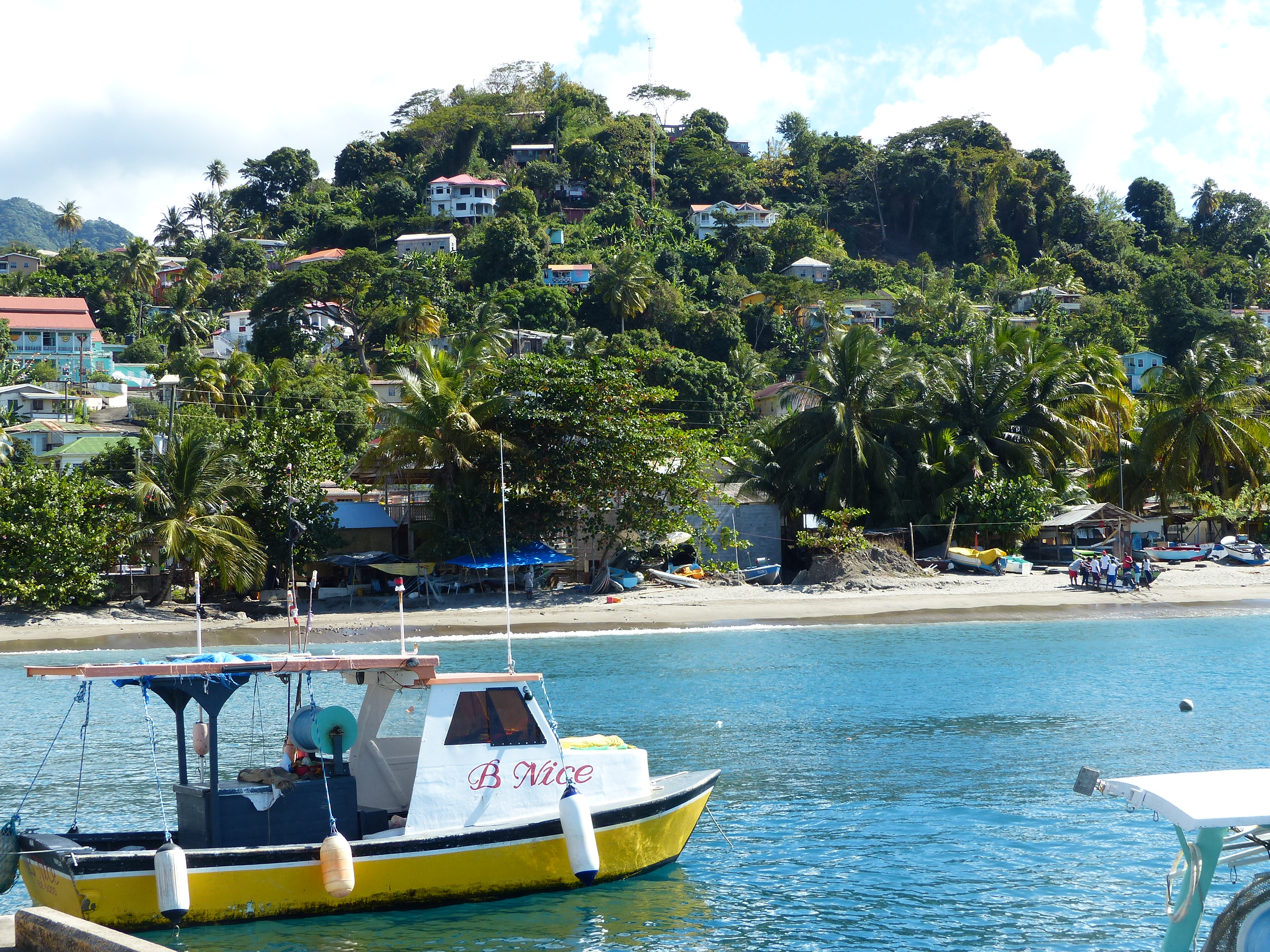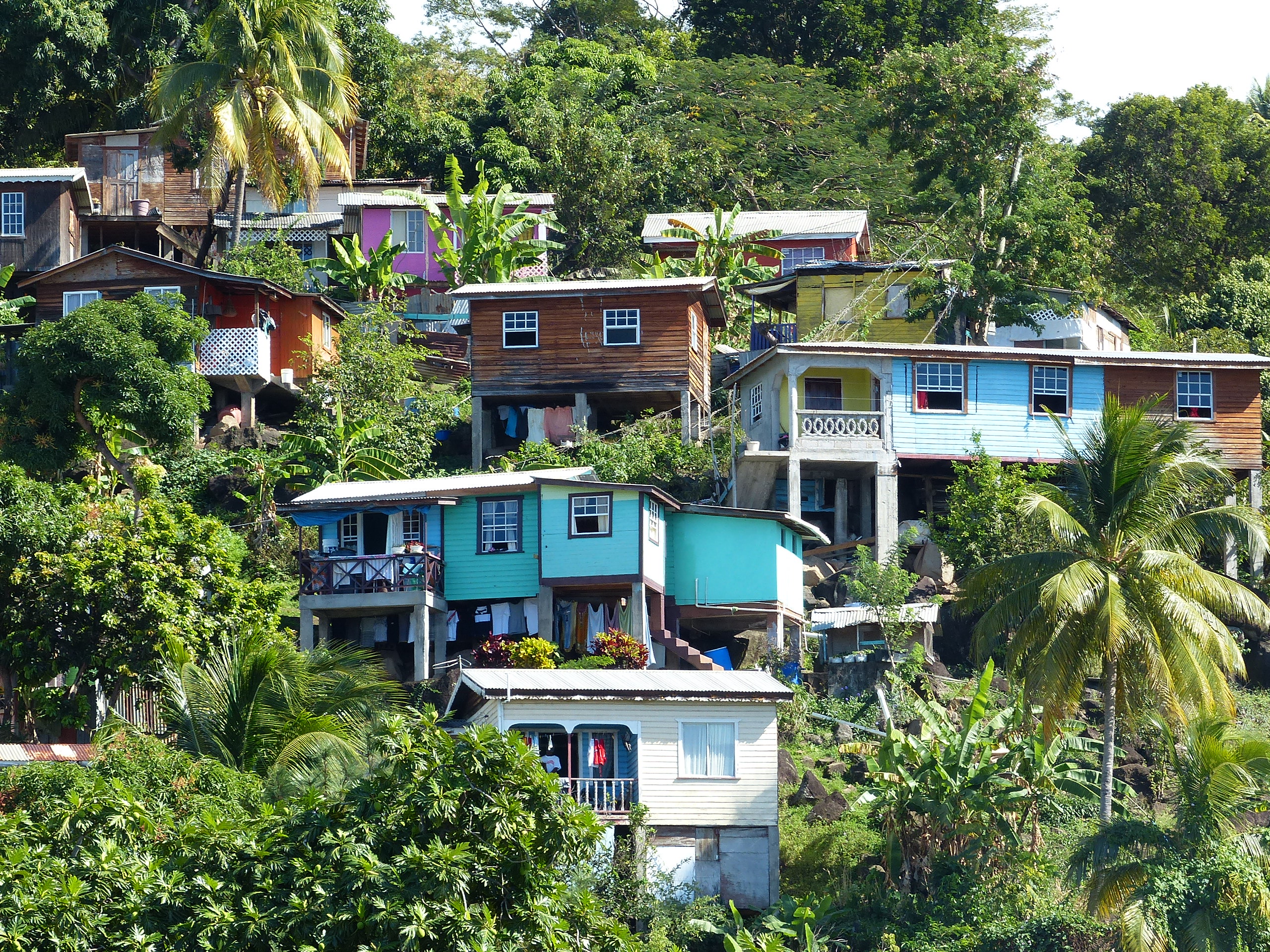 Nous continuons vers le nord, vers St Vincent et Ste Lucie. Plus grandes, ces iles semblent plus contrastées avec des villes riches et des villages plus démunis. Au nord de St Vincent nous nous arrêtons à Chateaubelair bay. Malheureusement pour le petit village, un fond de houle et une plage un peu trop pentue rendent l’accès en annexe délicat. Alors sur les bateaux de passage les équipages restent à bord et le village ne profite pas de cet apport économique. Quelques téméraires viennent sur les embarcations de fortune nous proposer des fruits et leur service pour visiter les alentours. Nous rencontrons Boy-Boy. Son nom semble être un gag mais quand plus tard nous demanderons le chemin de sa maison on nous l’indiquera sans hésitation, c’est donc bien comme cela qu’il s’appelle. Boy-Boy parle un peu français, il a appris avec des cassettes que lui a données une femme sur un bateau qui passe ici de temps en temps. « Une bretonne comme vous » nous dit-il. Il est malin Boy-boy il a repéré notre ‘gwen-a-du’ et tente le message « les bretons sont généreux ». le lendemain matin, profitant d’une houle un peu plus faible, nous arrivons enfin à débarquer et retrouvons Boy-Boy juste là quand il le faut près à nous aider. Curieux hasard pensons-nous que l’endroit où nous avons réussi à débarquer soit là où il vit. Naïfs que nous sommes ! Il n’y a pas de hasard, il n’est là que pour nous. Nous nous laissons faire et acceptons sa proposition de nous guider jusqu’aux chutes qui font la renommée de l’arrière-pays. L’endroit est effectivement sympathique. Nous remercions notre guide pour pouvoir profiter à notre rythme des lieux et convenons de le retrouver à sa maison. Même si nous ne nous attendions pas à une superbe villa nous sommes sous le coup en y arrivant. Sur un tout petit terrain en forte pente, Boy-Boy vit dans une masure de bois et de tôles. Sa pauvreté nous touche.