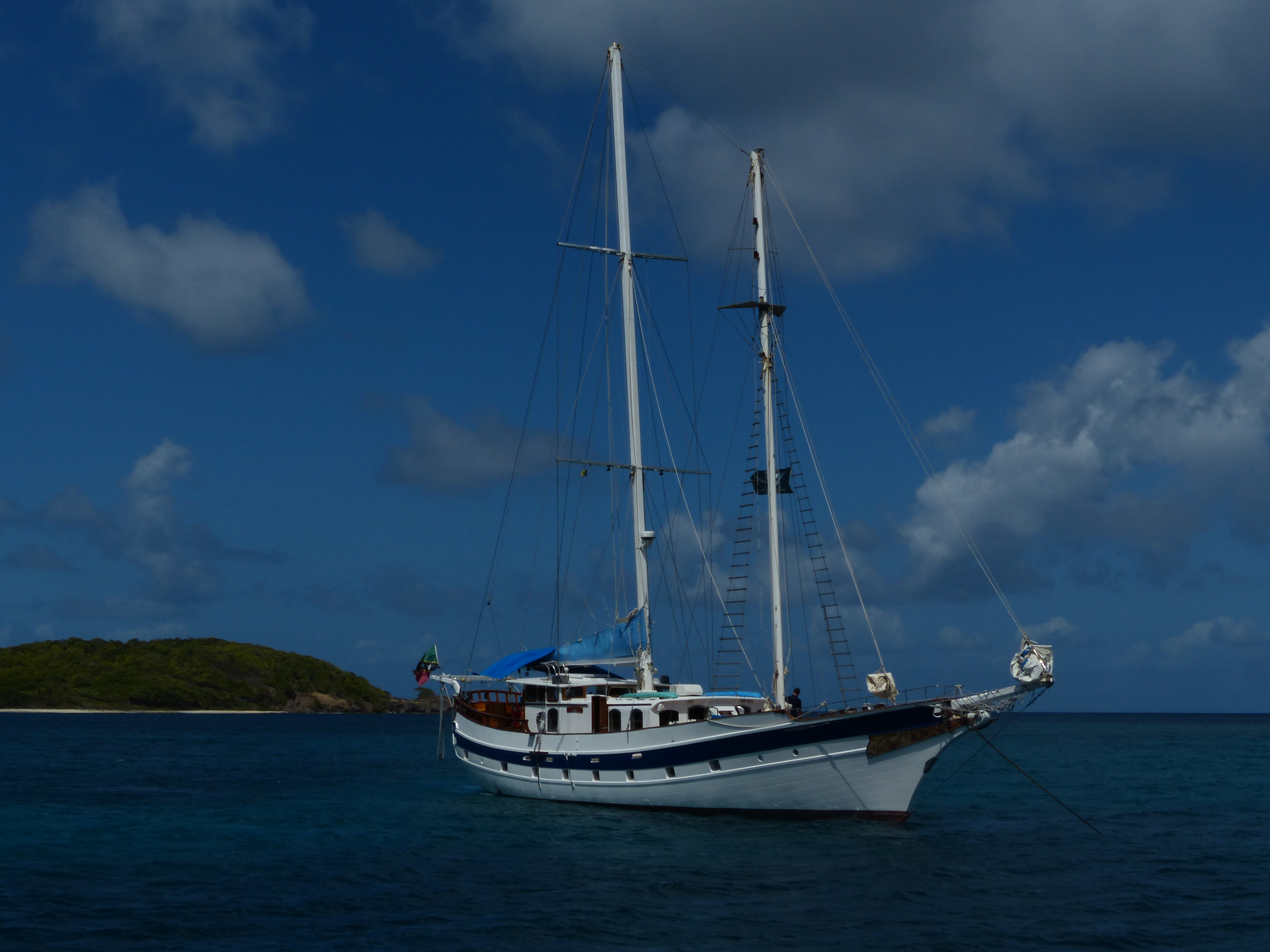 Les 80 Nm entre Tobago et Grenade sont avalés dans la journée, 10 heures de navigation toniques nous permettent de partir et d’arriver de jour. A Grenade nous trouvons la masse des bateaux de plaisance. Le grand port de St George et quelques baies aux alentours concentrent les mouillages. Ce sera toujours ainsi jusqu’en Martinique, quelques endroits bondés et la plupart des autres mouillages beaucoup plus calmes.