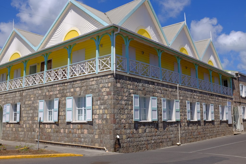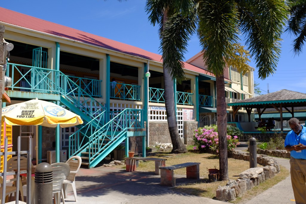 Nevis est calme, vraiment calme. Les gens marchent lentement, les voitures roulent doucement et s’arrêtent vingt mètres avant vous pour vous laisser traverser. On nous parle à voix basse, sans intonation. Visuellement nous ne sommes plus dans les mêmes Antilles. L’architecture est très différente, les bâtiments sont construits avec des rez-de-chaussée en pierres taillées grises, assemblées avec des angles nets et raides. Il s’en dégage une austérité toute protestante qui est contrebalancée par les étages qui eux sont en bois peints de couleurs vives. L’ensemble est agréable, équilibré.
