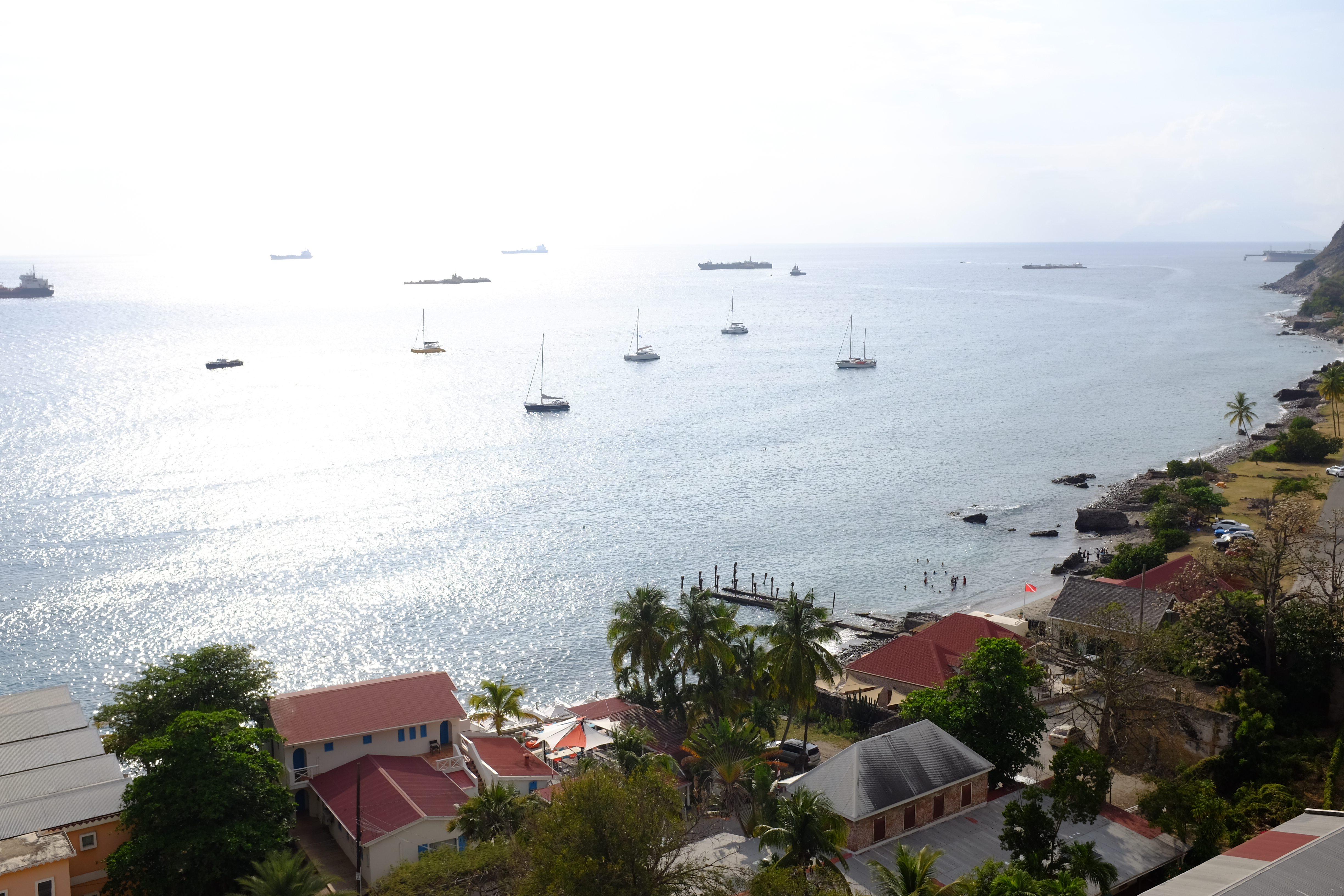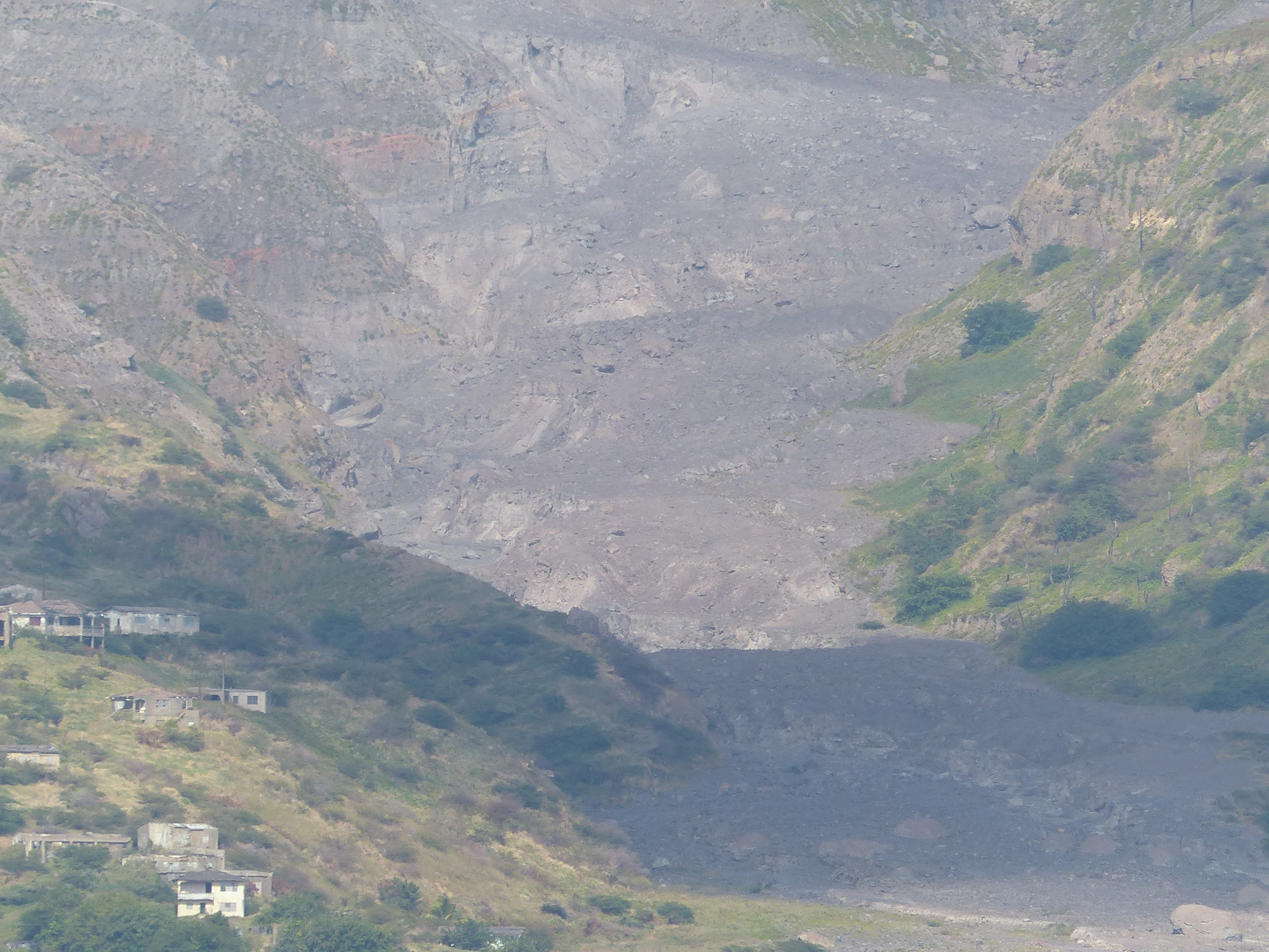 Nous continuons à longer la côte et sortons de la zone sensible du volcan. Assez rapidement nous voyons de nouvelles constructions, grandes et colorées, joyeuses et optimistes qui contrastent avec la désolation du sud de l’île. Dispersées à flanc de colline ces maison ne forment ni hameau ni ville. C’est une curieuse psychologie de reconstruction qui nous laisse interrogatifs. Nous mouillons devant un nouveau port qui n’est qu’une zone de débarquement un peu aménagée pour des barges et des bateaux de liaison. Notre projet initial était de partir randonner jusqu’au volcan, attirés par sa respiration mais il n’est pas accessible tous les jours et nous n’avons pas envie de nous faire emmener dans une promenade voyeuriste de la ville détruite.