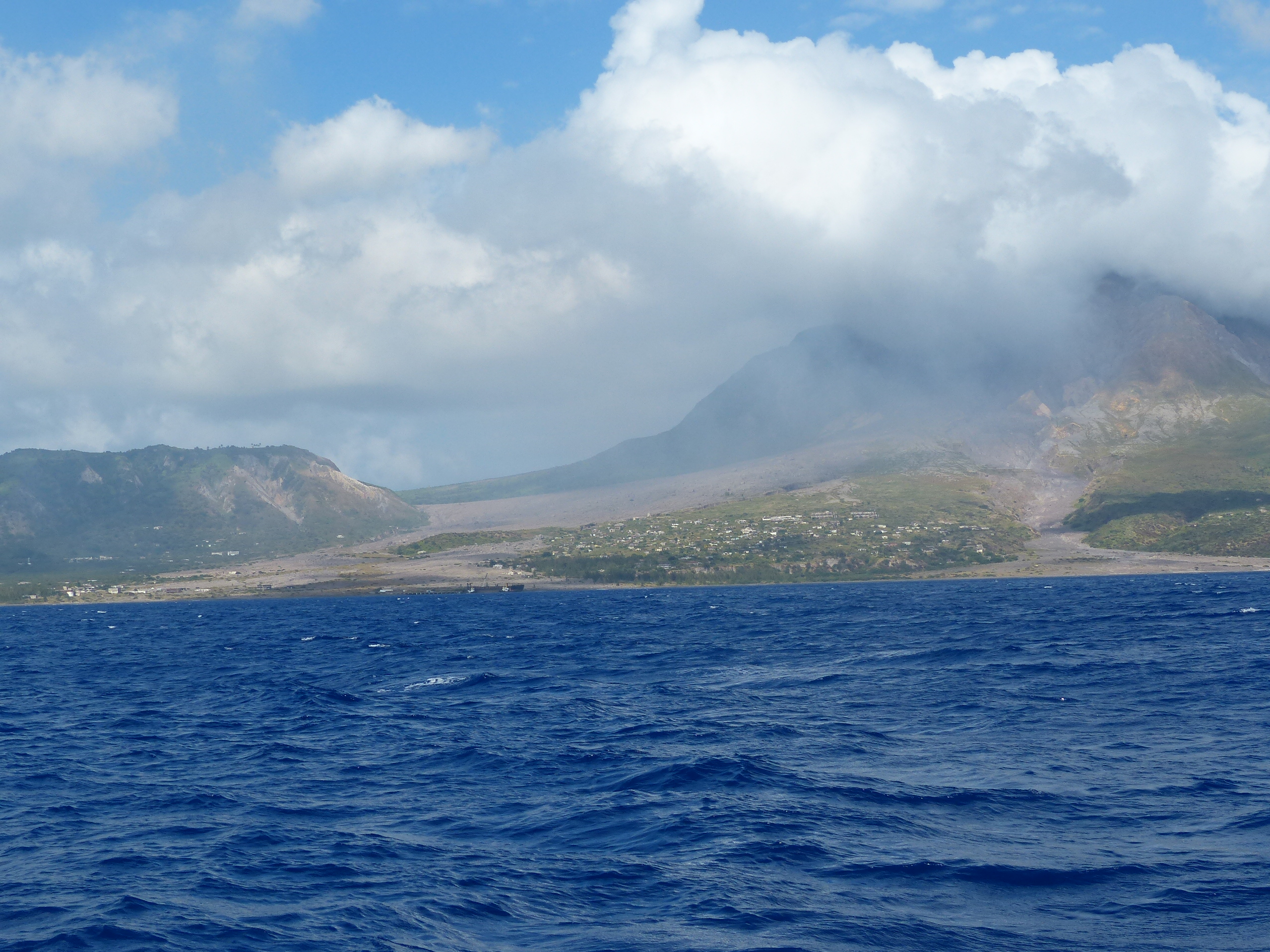 Sitôt partis, nous ressentons qu’il se passe quelque chose. Il n’y a plus de bateaux autour de nous, nous naviguons seuls ce qui est rare en ces régions. Nous progressons vers Montserrat, cette ile a la particularité d’avoir un volcan actif, la dernière éruption date de 1995, un grande partie a été ensevelie et la plus grande ville, la capitale, complétement détruite. L’activité volcanique est sous surveillance, les accès sont conditionnés aux humeurs du cratère. Quand la silhouette de Montserrat se précise et que nous commençons à distinguer les détails de la côte nous comprenons que nous avons basculé dans un autre monde. Fini les pentes verdoyantes et les plages de sable blanc. Fini les petits villages accueillants. Fini la douceur bisounours des Antilles touristiques. La côte sud par laquelle nous arrivons est brulée, arasée, laminée par des coulées de lave incroyables qui du cratère jusqu’à la mer ont tout emporté. Le cône fume toujours, un lourd nuage en descend et répand une forte odeur de soufre. Il nous est interdit d’approcher la côte à moins de 2 Nm (un peu moins de 4 km), nous trichons un peu pour mieux percevoir les détails de ce paysage minéral. En passant devant l’ancienne capitale nous distinguons clairement les ruines des maisons abandonnées et essayons d’imaginer sous une grande coulée de lave ce qui devait être le centre-ville. Un peu de végétation est réapparue dans ce qui a été le cœur de l’ile.