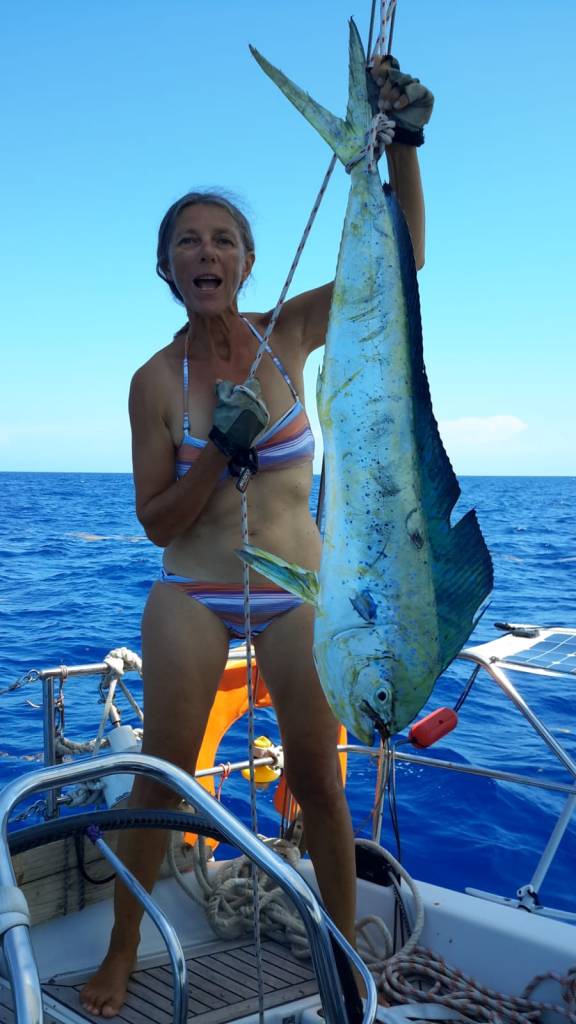 La plus belle prise : une daurade coryphène de 12 kilos par Hervé, celle de la photo n’en fait « que » 8. Pour autant, on est loin d’avoir perturber la régulation des espèces. Quatre daurades, une bonite, un barracuda plus un poisson dont j’ai oublié le nom péché avec Pierre aux îles du salut, soit sept en onze mois.