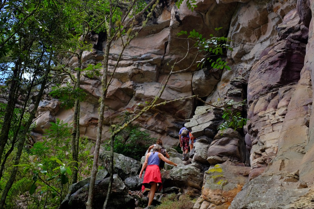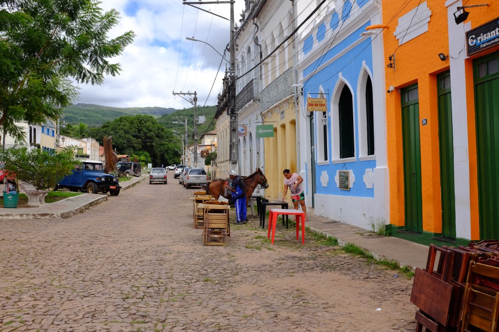 Alors on s’enfonce dans les terres, on prend de l’altitude et on va se mettre au vert dans le parc national de la Chapada Diamantina. Lençois, une petite citée coloniale, en est la porte d’entrée. Jusqu’à la création du parc, en 1985, c’était le domaine du diamant, la ville était riche, certaines bâtisses opulentes le témoignent, probablement celles des commerçants, des prêteurs sur gage car les garimpeiros, quand ils revenaient après plusieurs semaines passées à creuser la montagne avec quelques diamants dans les poches avaient la réputation de flamber dans la rue de la soif. On dit que les pavés des rues recèlent pleins de petits diamants tombés des poches lors des beuveries Cachaça, filles, jeux, paris, en quelques heures il ne leur restait plus qu’à repartir gratter la roche. Des histoires de vies pour alimenter l’imaginaire des scénarios de films, des romans et des chansons de Bernard Lavilliers. Maintenant la rue de la soif est bien proprette avec toutes ces petites maisons colorées qui abritent restaurants et cafés où se retrouvent les randonneurs de tous les pays.