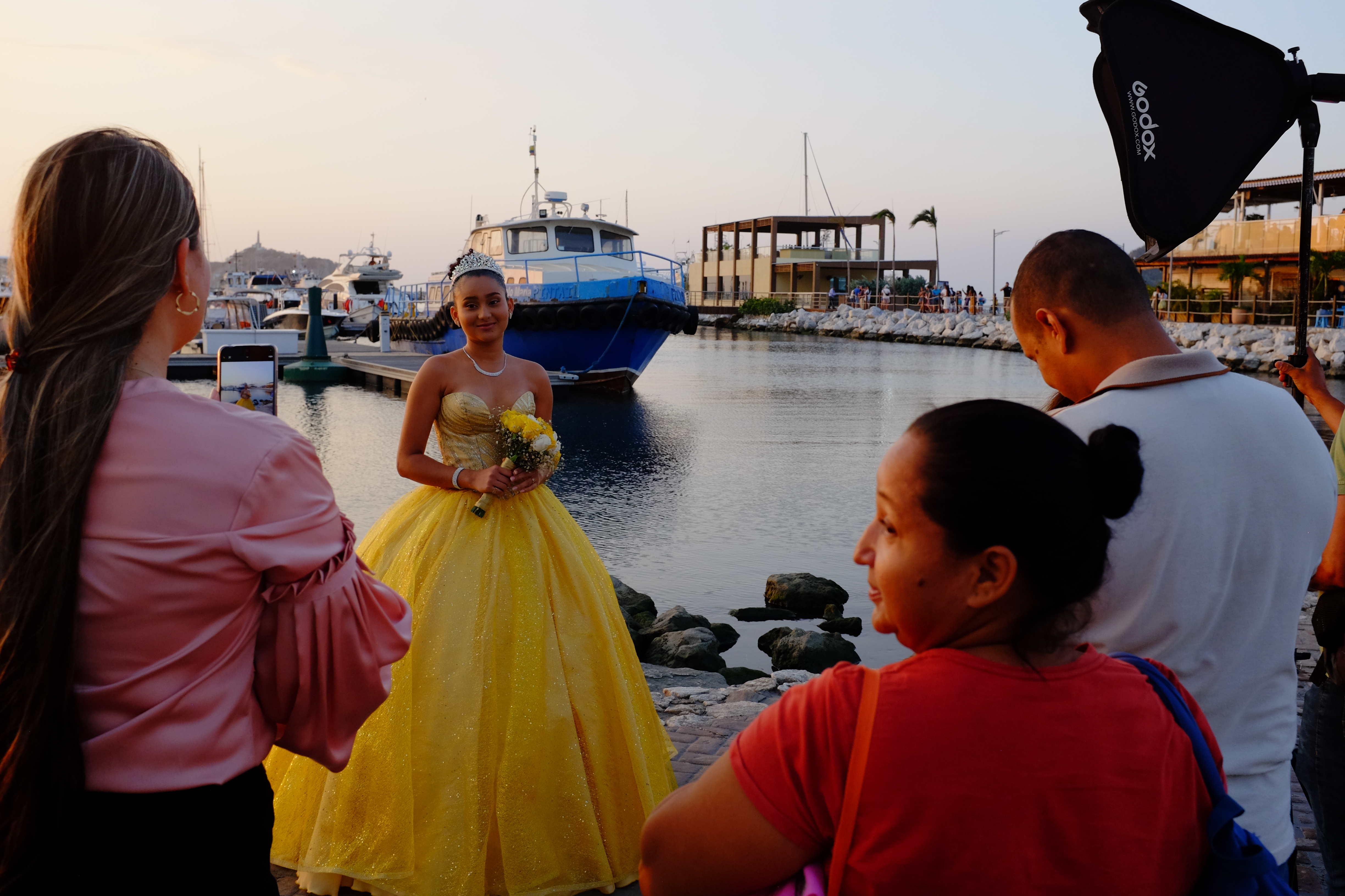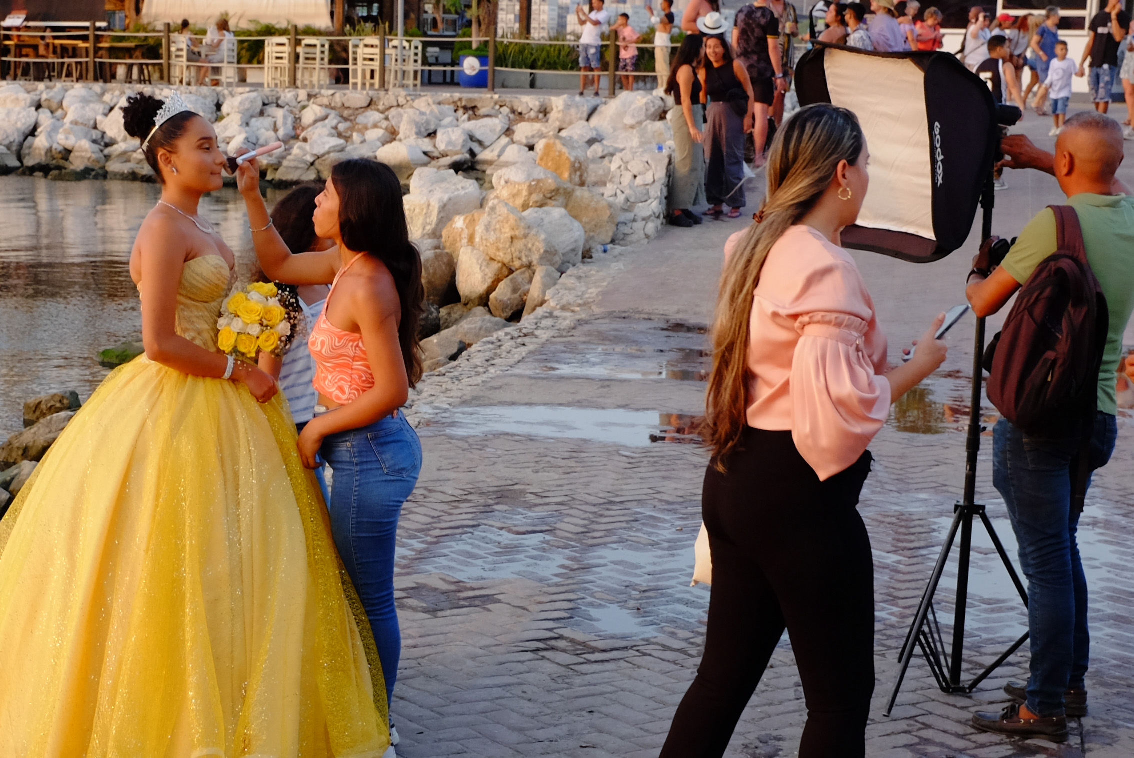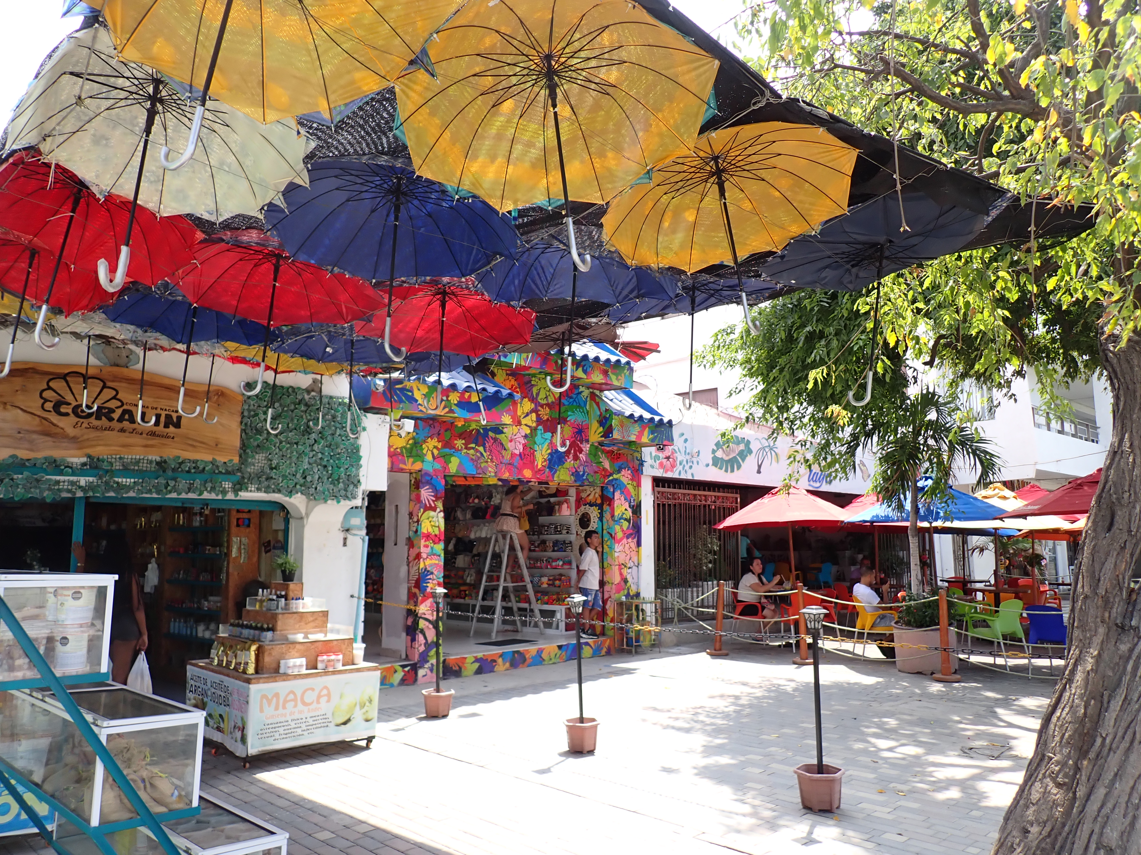 Quelle ambiance dans ces rues! C’est plein de vie, joyeux, détendu. Les vendeurs ambulants poussent leurs chariots de fruits, de brochettes, d’eau fraîche, vous les proposent sans insister. Depuis la plage, les baigneurs traversent la rue pour s’attabler aux terrasses. Sur le remblai, les jeunes filles habillées en princesse fêtent leur 14 printemps, passage important en Amérique latine. Le must semble être la photographie devant la marina et le policier qui passe par là peut être sollicité pour immortaliser toute la famille.