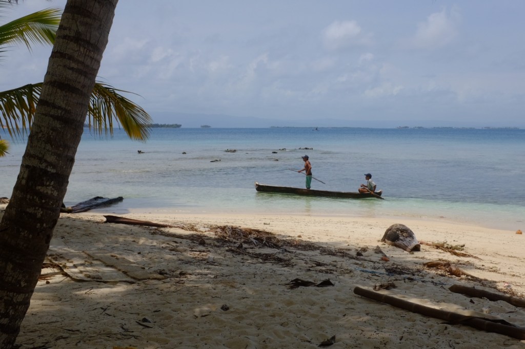 Leur vie au quotidien se doit d’être en autonomie : pas de réseau d’eau, d’électricité ou de téléphone, pas de plantation, pas d’élevage, pas de faune à chasser. Le ravitaillement du continent fourni l’essentiel pour ceux qui savent limiter leurs besoins au strict minimum. Les voiliers de passage apportent quelques dollars échangés contre des poissons, des langoustes ou de l’artisanat textile local, jolis carrés décoratifs entre patchwork et broderie appelés « molas ». Nous sommes sollicités pour de l’eau, de l’huile ou de la farine, ceux d’entre nous qui possèdent un déssalinisateur rendent de grands services. Les déplacements entre les îles se font en pirogue, à la pagaie ou plus rarement à la voile. Les Gunas ont leur dialecte, parlent également espagnol, parfois un peu l’anglais et ajoutent quelques mots de français pour nous faire plaisir.