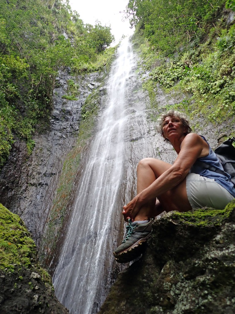 Kua et Taiki sont les parfaits représentants de cet art de vivre liant tradition et modernité. La vallée de Hakaui où leur faré est construit sur la terre de leurs ancêtres, n’est accessible qu’en pirogue. Pas vraiment un village mais une dizaine de maisons le long de la voie royale qui mène à la cascade de Vaipo. C’est une randonnée prisée des popas (qui n’est pas polynésien est popa), elle chemine entre rivière et falaise sous le couvert de la végétation qui protège de l’ardeur du soleil et nous conduit en quelques heures à la plus haute des cascades des Marquises. Elle est parsemée de nombreux vestiges témoins de l’importance des lieux, terrasses, pétroglyphes, sépultures et voie royale. C’est un chemin pavé sur plusieurs kilomètres afin de porter le chef, qui dans certaine tribu est un demi-dieu et ne devait en aucun cas devoir toucher le sol de ses pieds. Comme nous ne sommes pas de la bonne caste, c’est bien avec nos pieds que nous avons foulés ces pavés plus ou moins déchaussés et c’est avec bonheur que nous nous sommes arrêtés à notre retour à la table d’hôte de Kua et Taiki. Une cuisine simple, uniquement les produits du jardin, de la pêche, de la chasse. Quel plaisir de reposer ses jambes, installé devant un bon repas à écouter les histoires de Taiki. C’est un personnage théâtral, un peu farceur, un peu provocateur mais fervent défenseur de sa vallée.