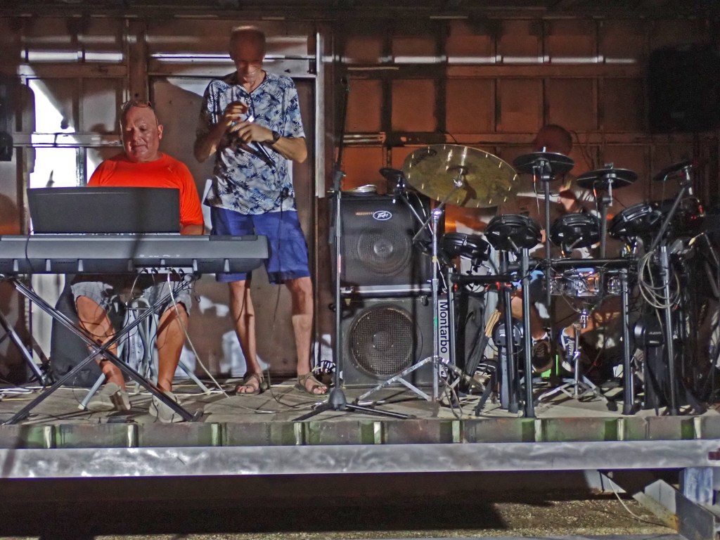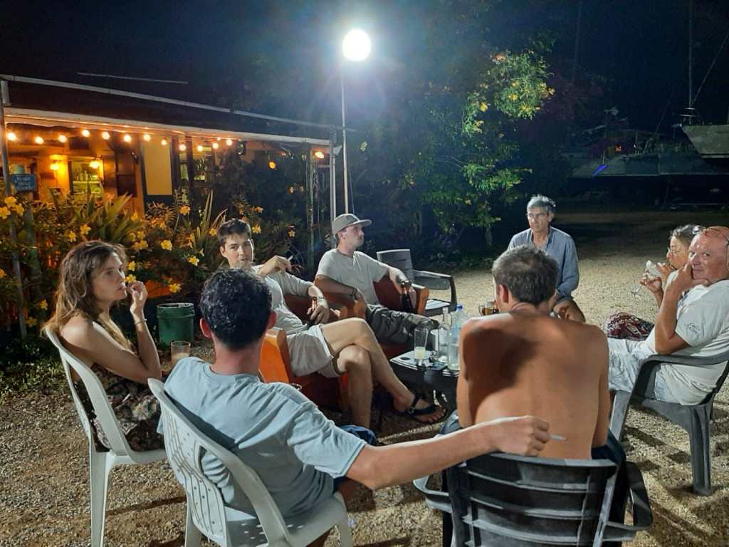 Quand le soir tombe, que les corps ont bien transpiré sous les coques, Tous se retrouvent au bar restaurant. La bière, bien fraîche, est savourée comme le meilleur moment de la journée. Les boules de pétanques sortent des étuis, des tournois internationaux s’organisent. Jean Paul recrute des musiciens parmi les marins car le samedi soir, dans un container aménagé en scène, derrière sa batterie, il fait le bœuf avec eux.