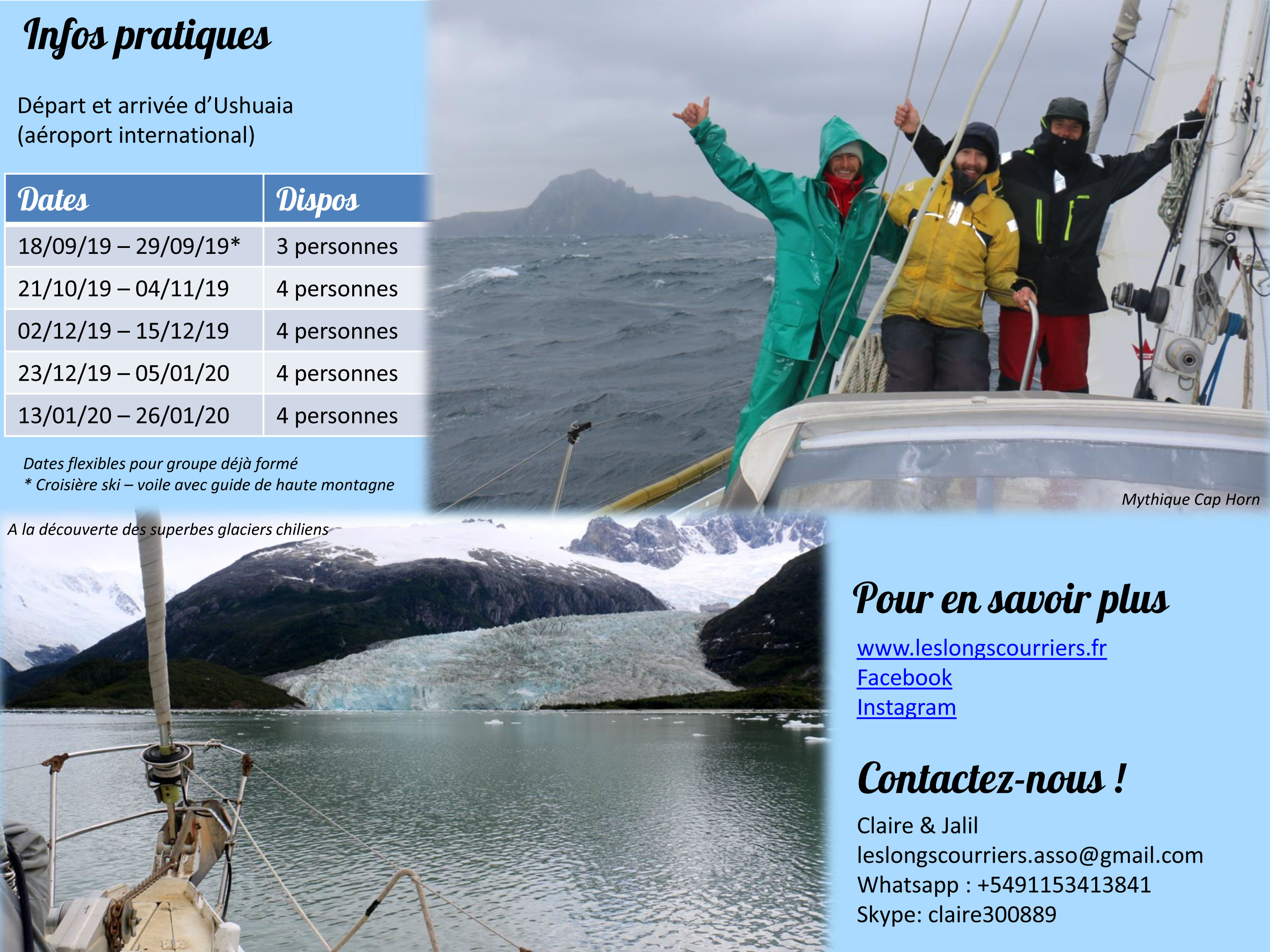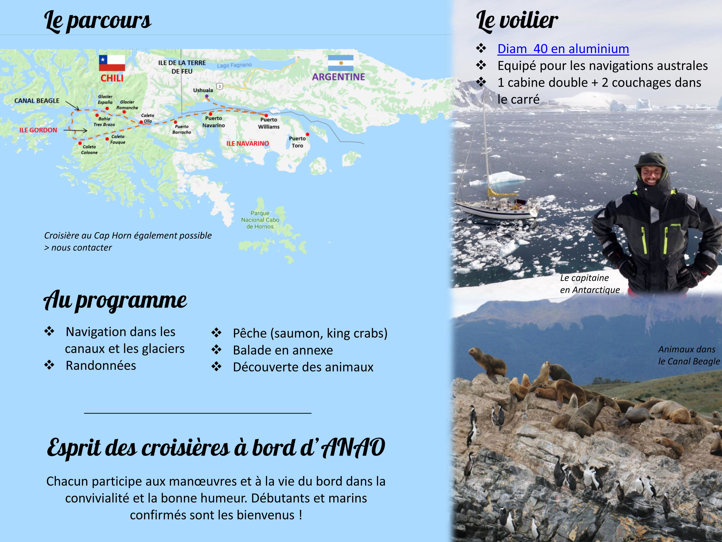 Claire et Jalil sont deux amis rencontrés il y a 3 ans aux Açores, ils commençaient un long tour du monde sur leur voilier Anao , …. Ils sont descendu le long de l’Afrique, du Brésil, de l’Argentine jusqu’en Antartique et seront pour la 3eme saison en Patagonie qu’ils connaissent maintenant bien pour en avoir sillonné les canaux, caletas et saluer le Horn plusieurs fois. Tandis que Claire restera à Ushuaia pour pouponner un petit Patagon qui doit voir le jour mi juillet, Jalil propose d’emmener des rêveurs du grand sud pour des navigations vers les glaciers, le Horn et même une session en montagne avec un guide. Si l’aventure vous tente, nous ne pouvons que vous recommander Jalil, skipper compétent, qui partagera facilement sa passion dans une ambiance décontractée.